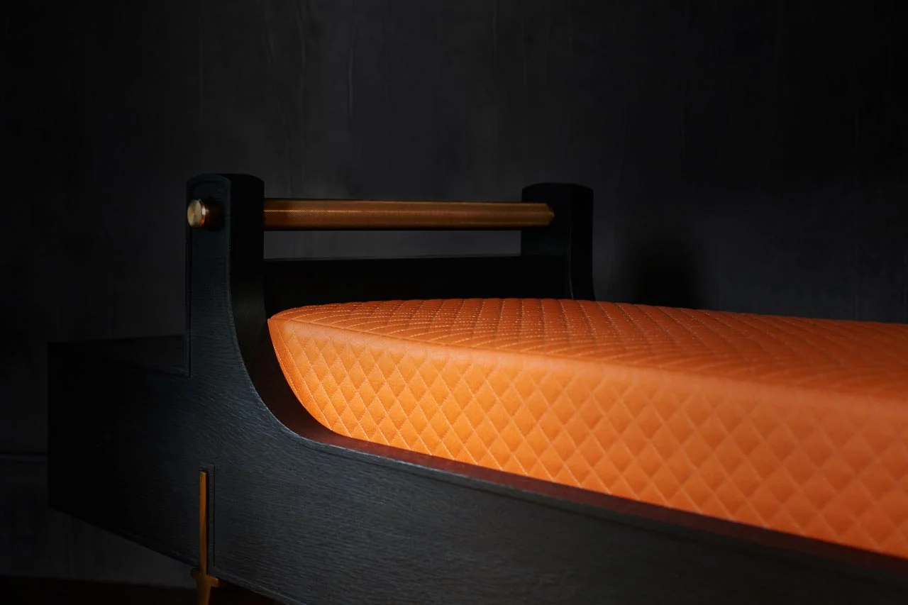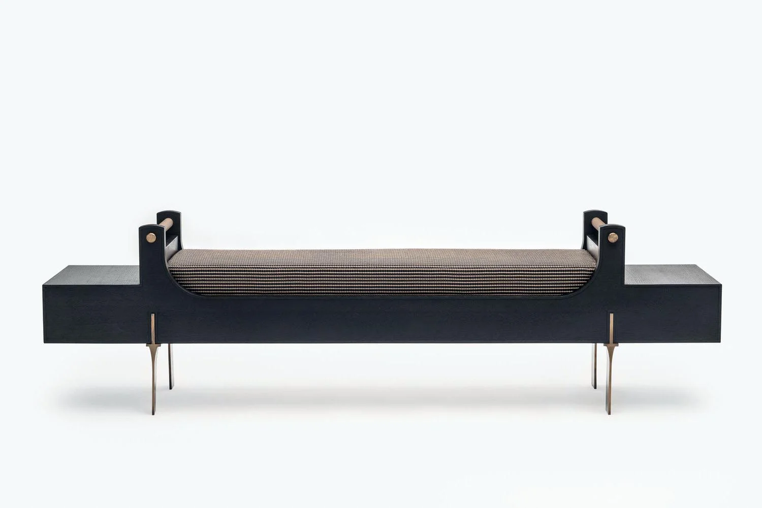 Upholstered cushion, cast bronze legs and knurled bronze handles Gallery Bench.